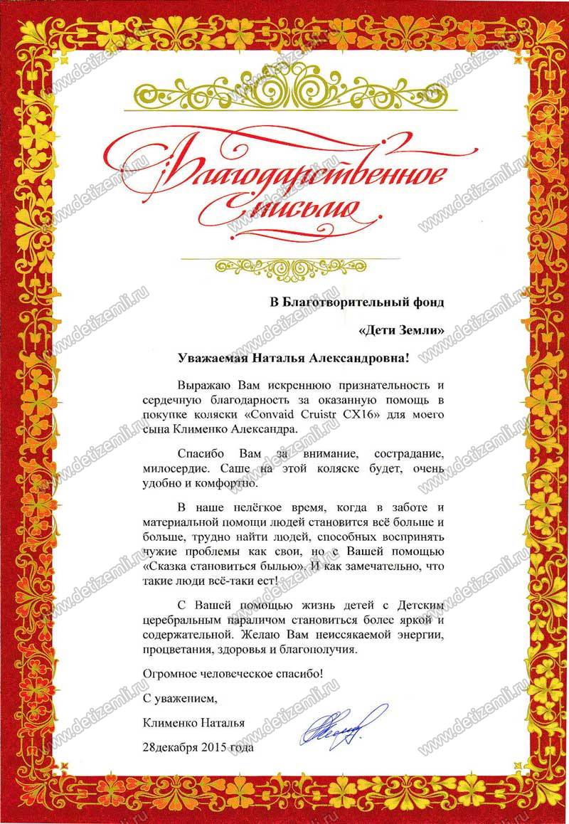 Здравствуйте, пишет Вам мама Верзилина Максима. Хочу выразить огромную Благодарность Смирнову В. Е., спасибо Вам большое за то, что Вы внесли огромный вклад в судьбу моего сыночка. Благодаря фонда «Дети Земли» и Вашей помощи мы прошли курс реабилитации в медицинском центре «Сакура» в мае 2016 года в г. Челябинске. После пройденных курсов Максим научился стоять 1,5 — 2 минуты самостоятельно и делать