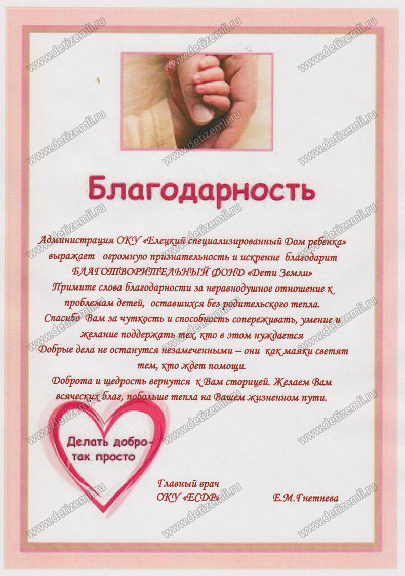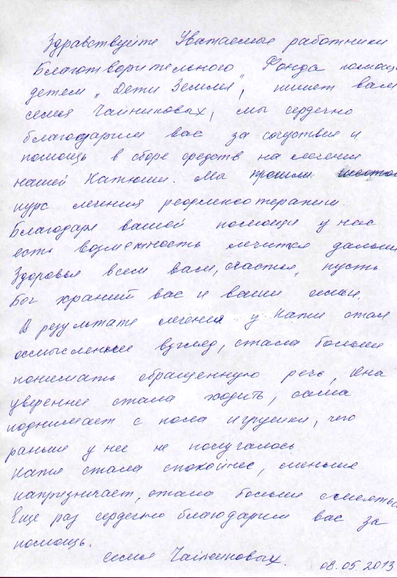 Благодарственное письмо Благотворительному фонду помощи детям «Дети Земли» от родителей Байковой Динары