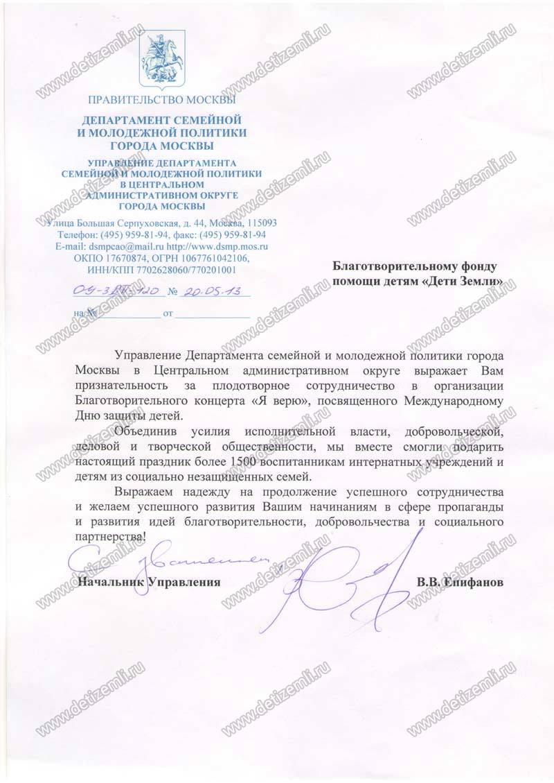 Благодарность от Департамента семейной и молодежной политики г. Москвы
