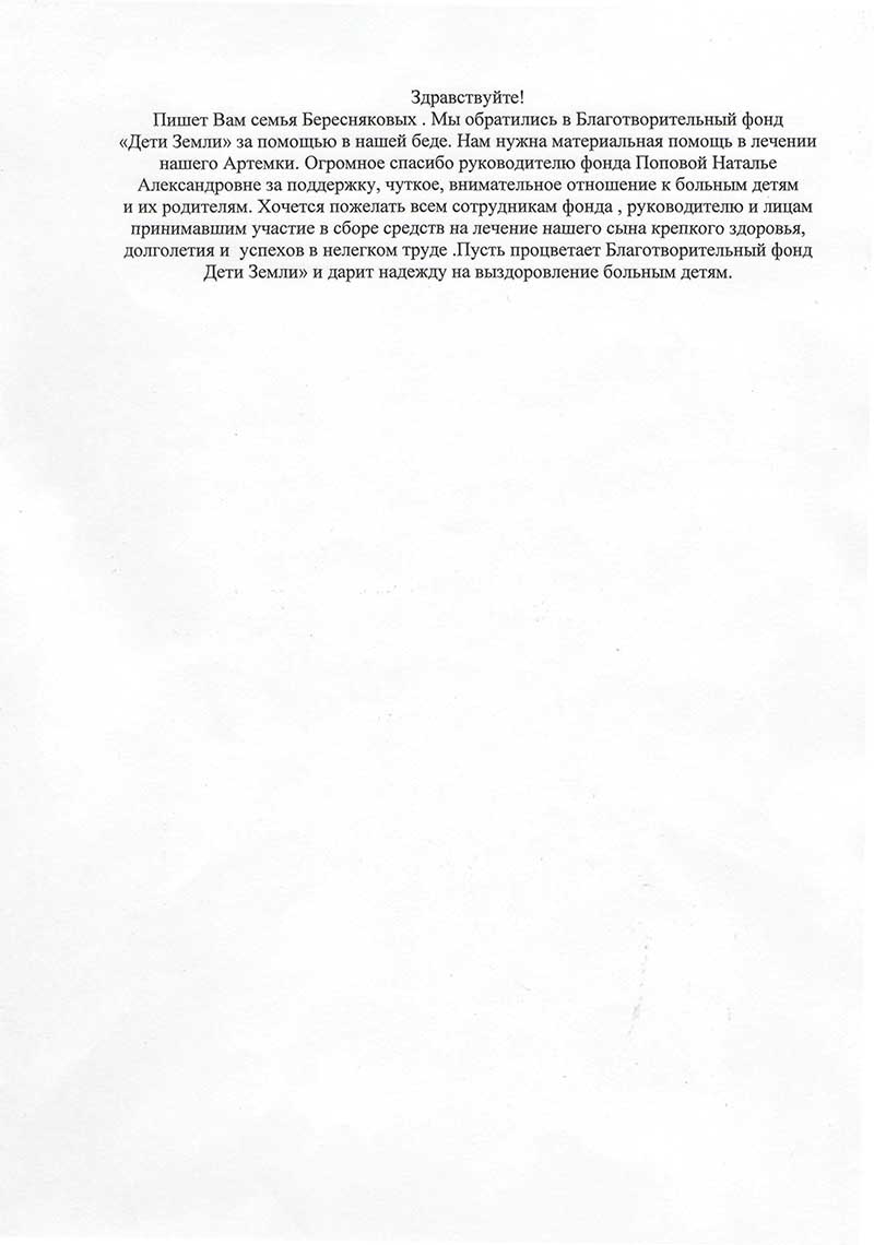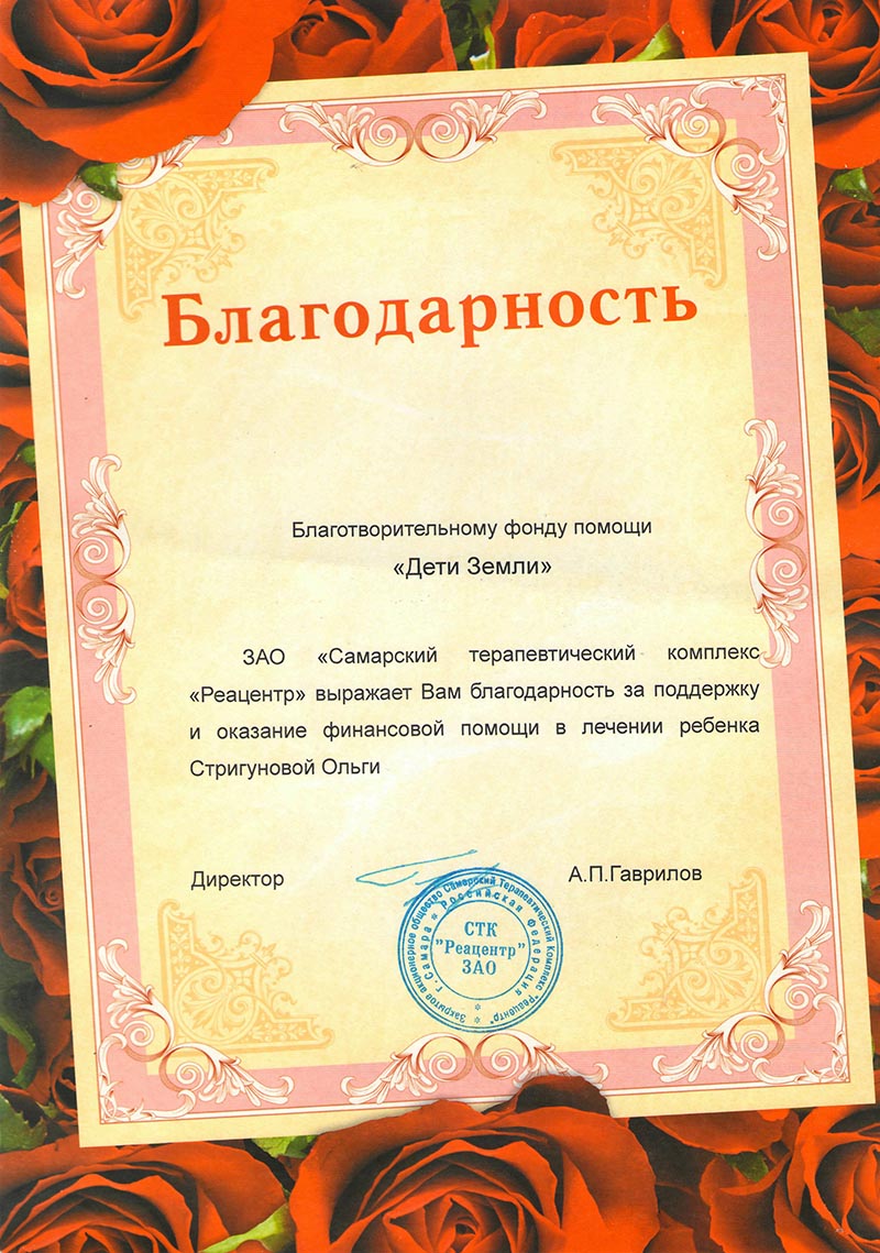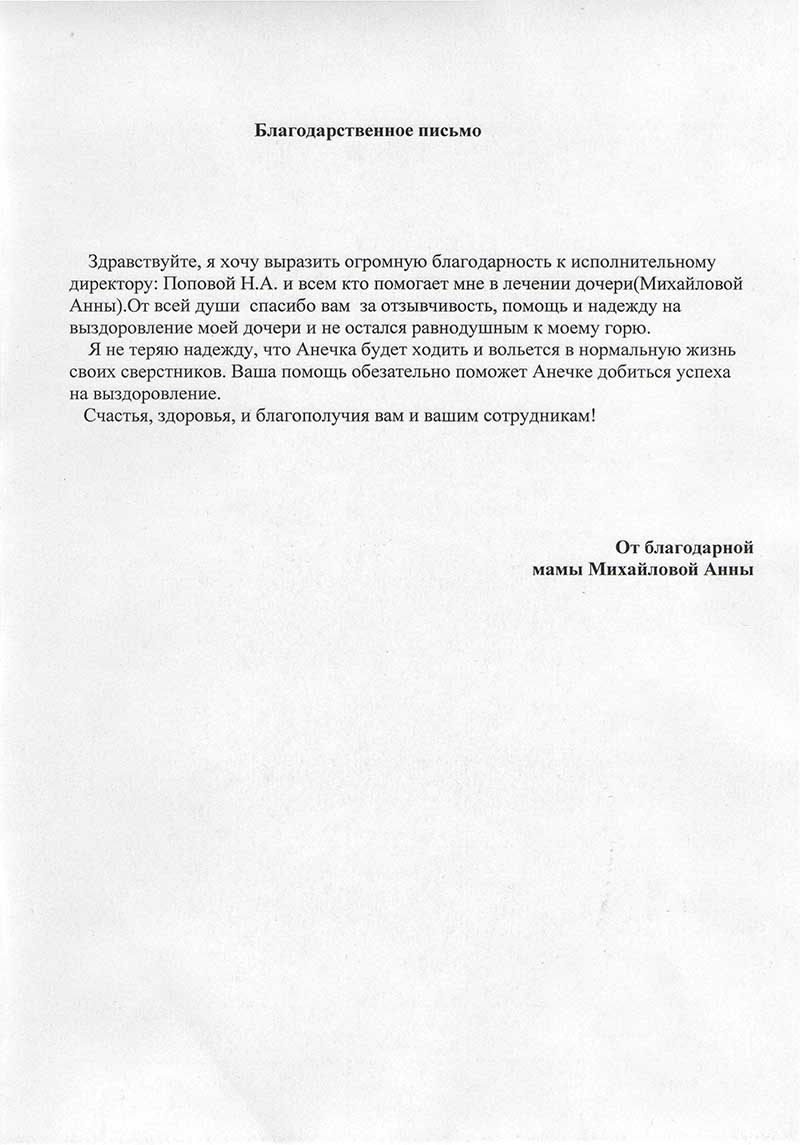 Мы тронуты Вашей заботой и участием в в решении нашей семейной проблемы: здоровьем и жизни нашей Маши. Благодарим Вас и всех сотрудников Благотворительного Фонда "Дети Земли" за оказанную материальную помощь в лечении нашей малышки Маши.