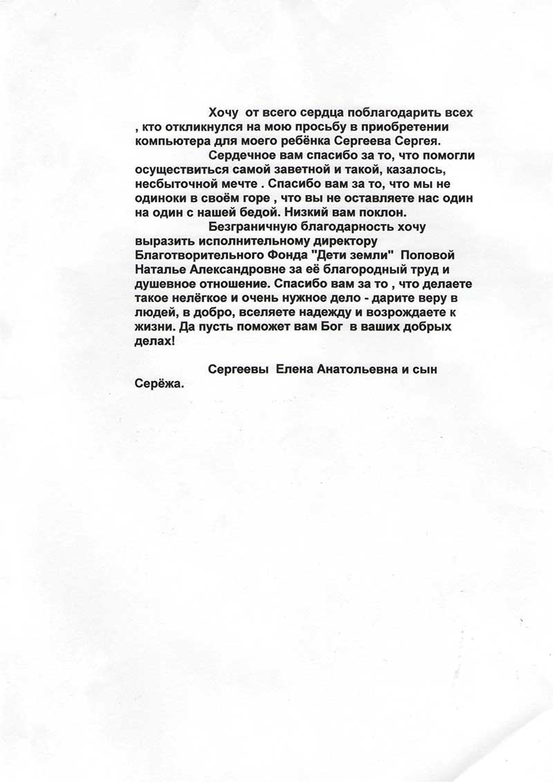 Письмо мамы Сергеева Сережи Елены Анатольевны