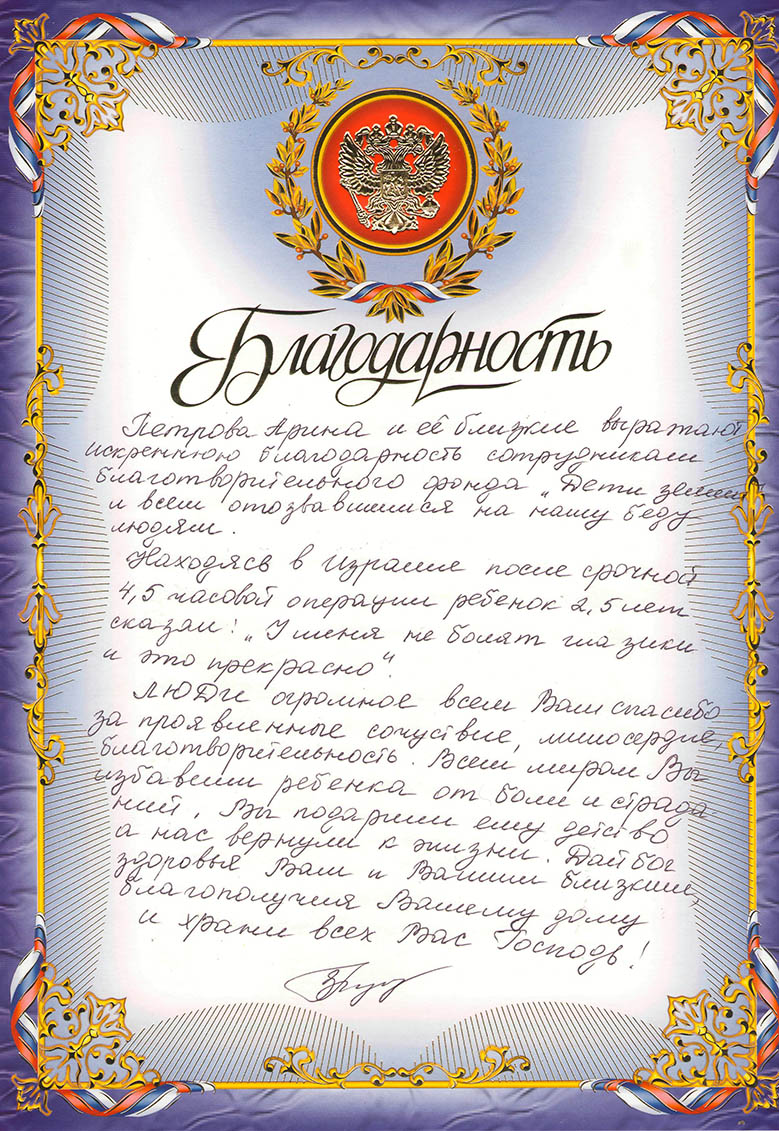 Искренняя благодарность и низкий поклон Вам за то, что Вы в такое трудное время помогаете больным детям, детям-инвалидам и сиротам, делаете добро людям,отчаявшимся получить реальную помощь от государства. Благодаря Вам и Вашему Фонду множество детей обретают надежду на выздоровление и получают реальный шанс быть счастливыми и жить полнокровной,полноправной и радостной жизнью.