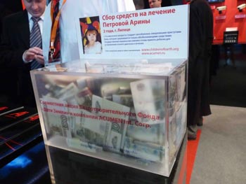 17.04.09. 16 апреля 2009г. закончилась благотворительная акция, которая проводилась на выставке MIPS-2009 в ТВЦ на Красной Пресне г. Москва. Средства, собранные от проведения акции, направлены на лечение Петровой Арины. Всего было собрано 24 912 рублей. Мы благодарим руководство компании Акьюмен за помощь в организации благотворительной акции. Фото смотрите в фотогалерее.