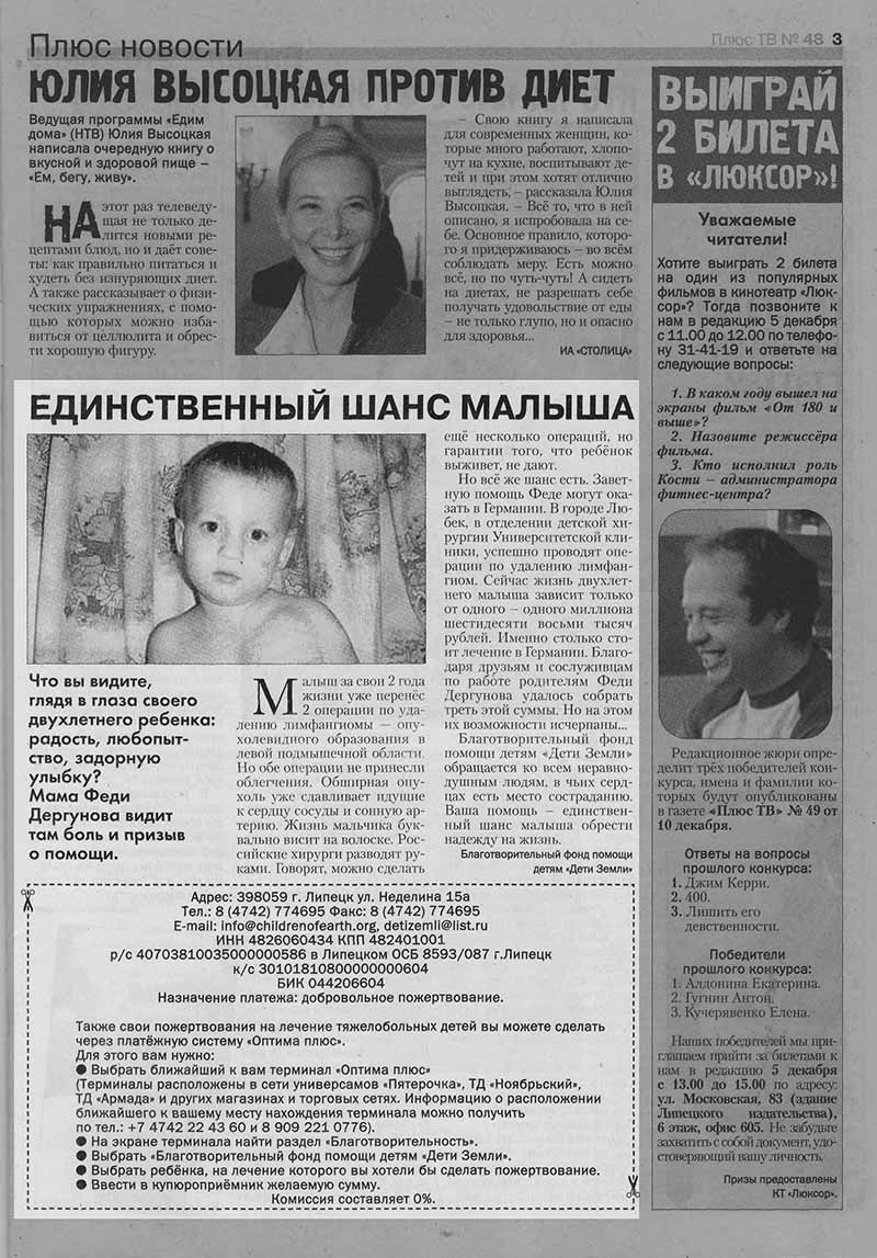 Мы уже неоднократно рассказывали о благотворительном фонде «Дети Земли». Безусловно, забота о больных детях – дело очень важное и нужное. И конечно же, все свершения и добрые дела были бы невозможны без вашей помощи и поддержки. Сотрудники фонда «Дети Земли» благодарят всех тех, кто не остался безразличным к чужому горю, тех, кто беспокоится о жизни и здоровье малышей, тех, в чьем сердце живет любовь и сострадание! А так же спешат поделиться новостями из жизни и деятельности фонда.