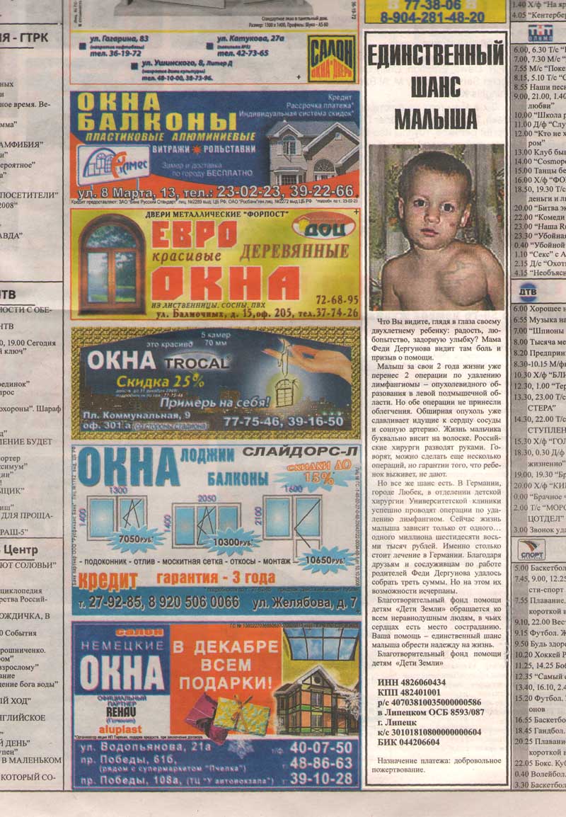 Но все же шанс есть. Заветную помощь Феде могут оказать в Германии. В городе Любек, в отделении детской хирургии Университетской клиники успешно проводят операции по удалению лимфангиом. Сейчас жизнь двухлетнего малыша зависит только от одного… одного миллиона шестидесяти восьми тысяч рублей. Именно столько стоит лечение в Германии. Благодаря друзьям и сослуживцам по работе родителям Феди Дергунова удалось собрать треть этой суммы. Но на этом их возможности исчерпаны…