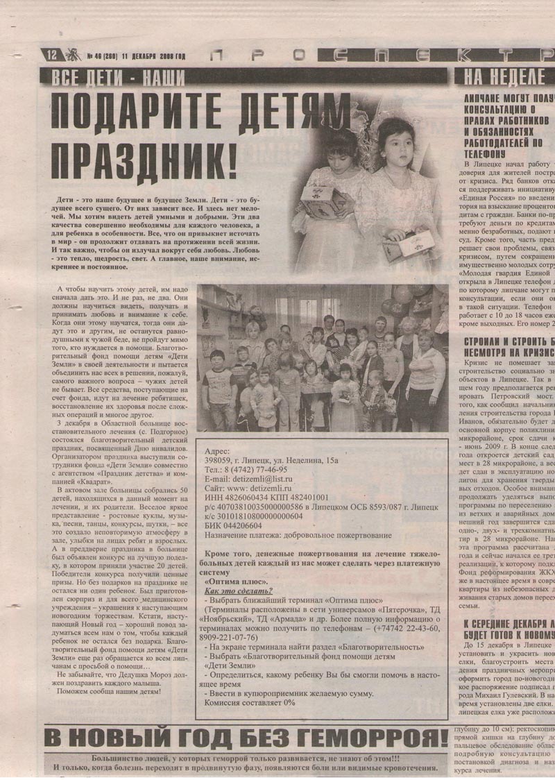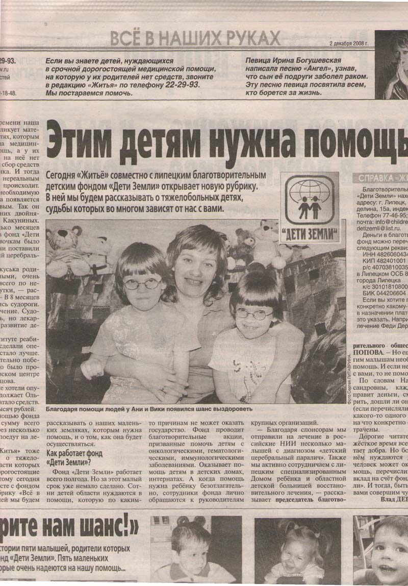Мы уже неоднократно рассказывали о благотворительном фонде «Дети Земли». Безусловно, забота о больных детях – дело очень важное и нужное. И конечно же, все свершения и добрые дела были бы невозможны без вашей помощи и поддержки. Сотрудники фонда «Дети Земли» благодарят всех тех, кто не остался безразличным к чужому горю, тех, кто беспокоится о жизни и здоровье малышей, тех, в чьем сердце живет любовь и сострадание! А так же спешат поделиться новостями из жизни и деятельности фонда. В современном мире нас окружает много боли и несправедливости. Вооруженный конфликт в Южной Осетии привел к гибели тысячи ни в чем не повинных людей: стариков, женщин, детей. Благотворительный фонд «Дети Земли» внес свою каплю помощи в дело спасения детей Цхинвала и всей Южной Осетии. Перечислено 5.000 рублей в Министерство труда и социального развития РСО - Алания, которое занимается сбором гуманитарной помощи для пострадавших в Южной Осетии.