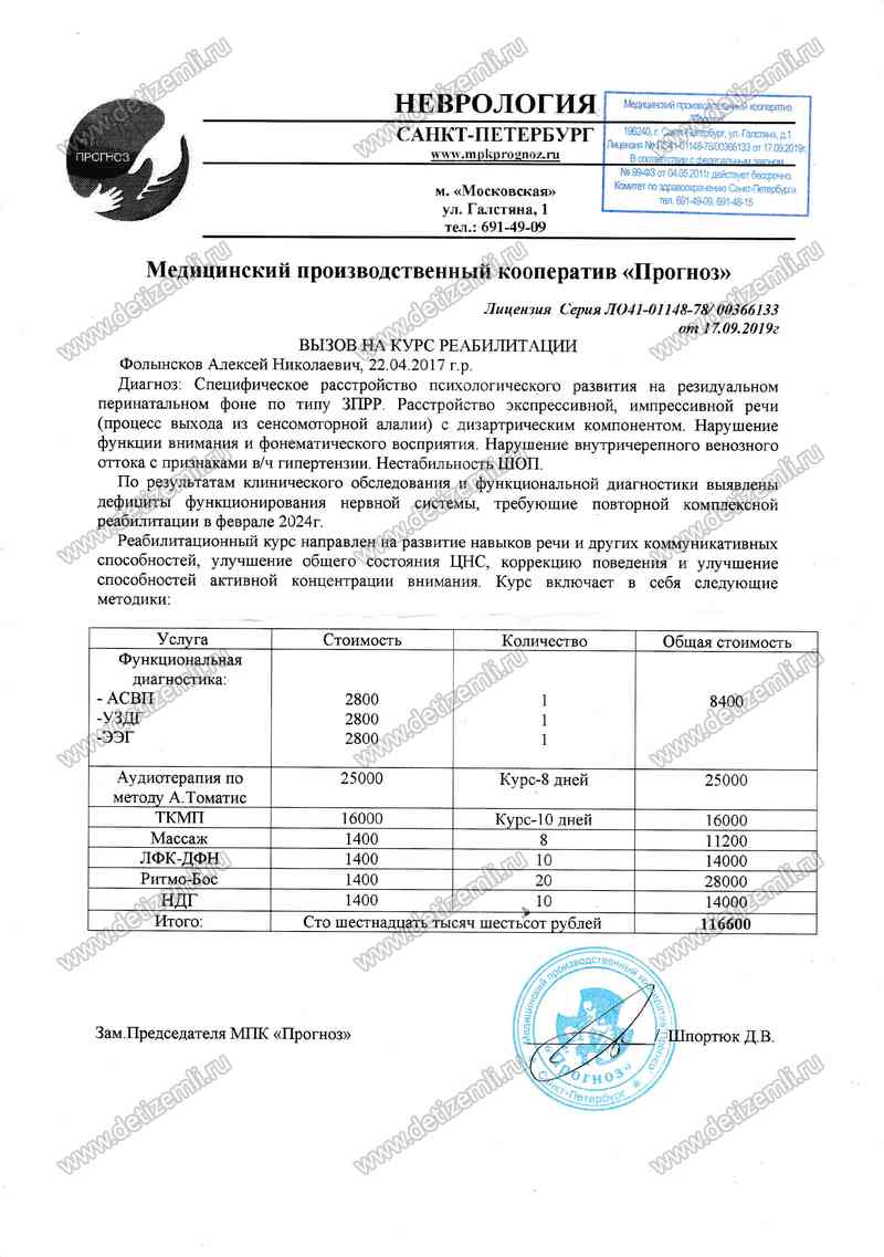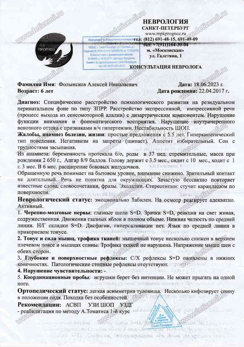 Здравствуйте! Хочу рассказать о успехах Алешки в результате лечения в клинике «Прогноз» в г. Санкт-Петербург.