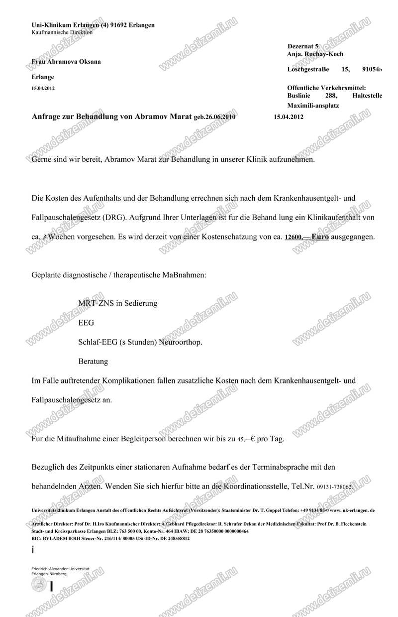 Оплачено лечение Марата стоимостью 12600 евро в немецкой клинике.