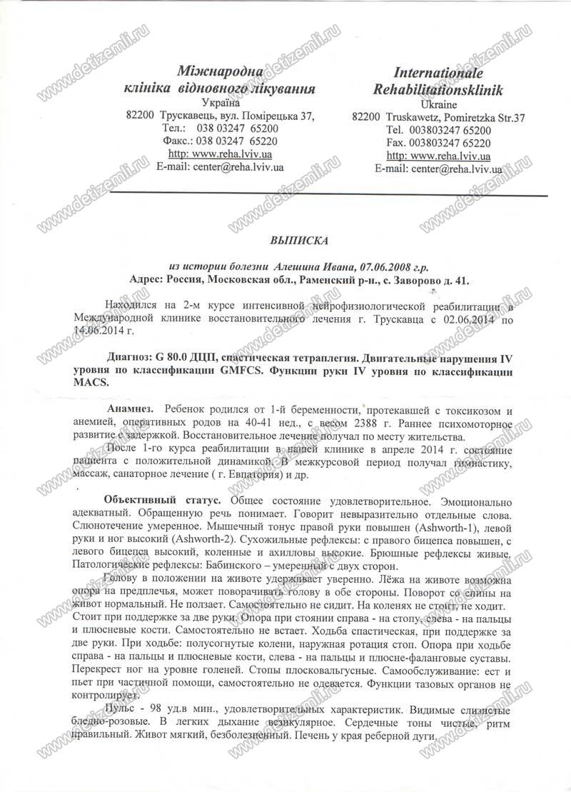 Я Алешин Сергей Анатольевич, 1963 г. рождения сам я пенсионер МВД с 2010 года. Пришлось уволиться из органов внутренних дел, чтобы все силы бросить на лечение ребёнка. Ваню я усыновил в 2010 году. Т. к ребёнок прописан был в Марий Эл Россия как сами понимаете там никакой перспективы на периферии в лечении всё очень далеко, деревня где Ванюша был прописан, а в
