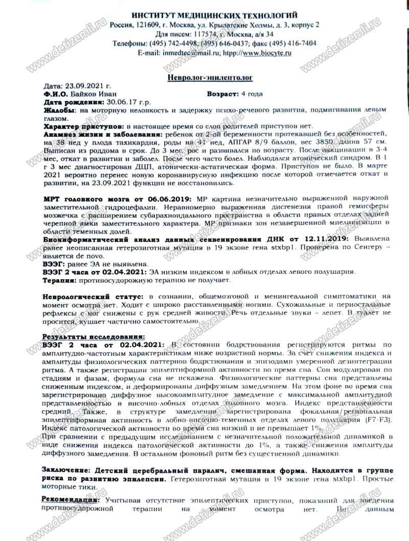 Благотворительный фонд помощи детям «Дети Земли» оплатил лечение Ивана Байкова стоимостью 100000 рублей. Благодарим жертвователей за помощь и поддержку!