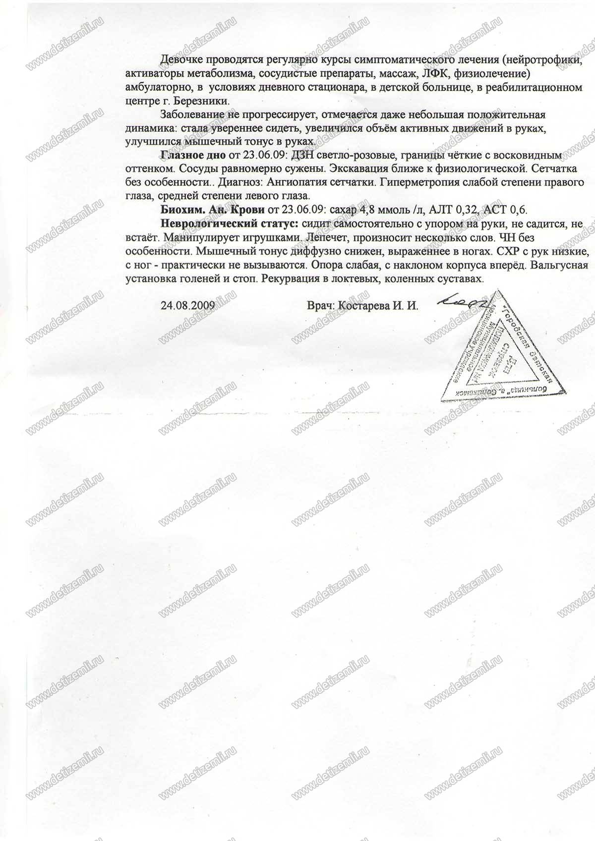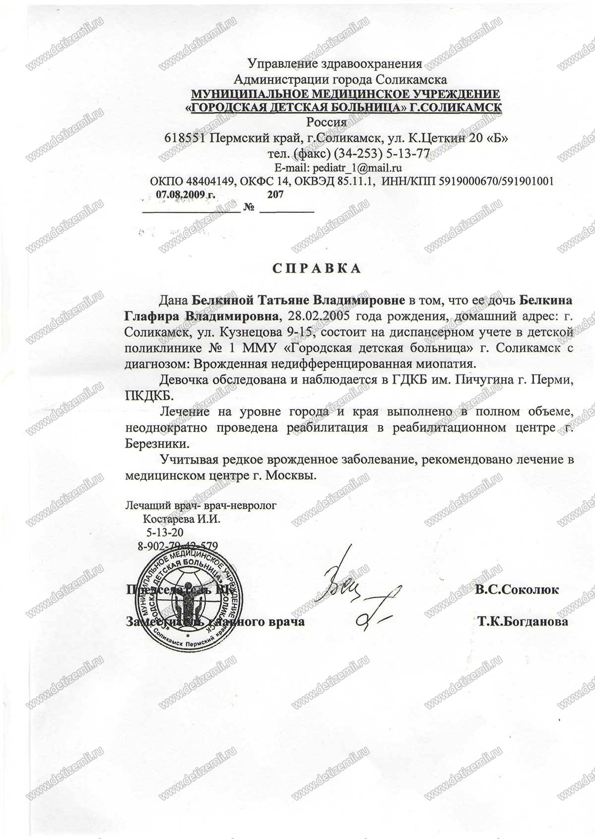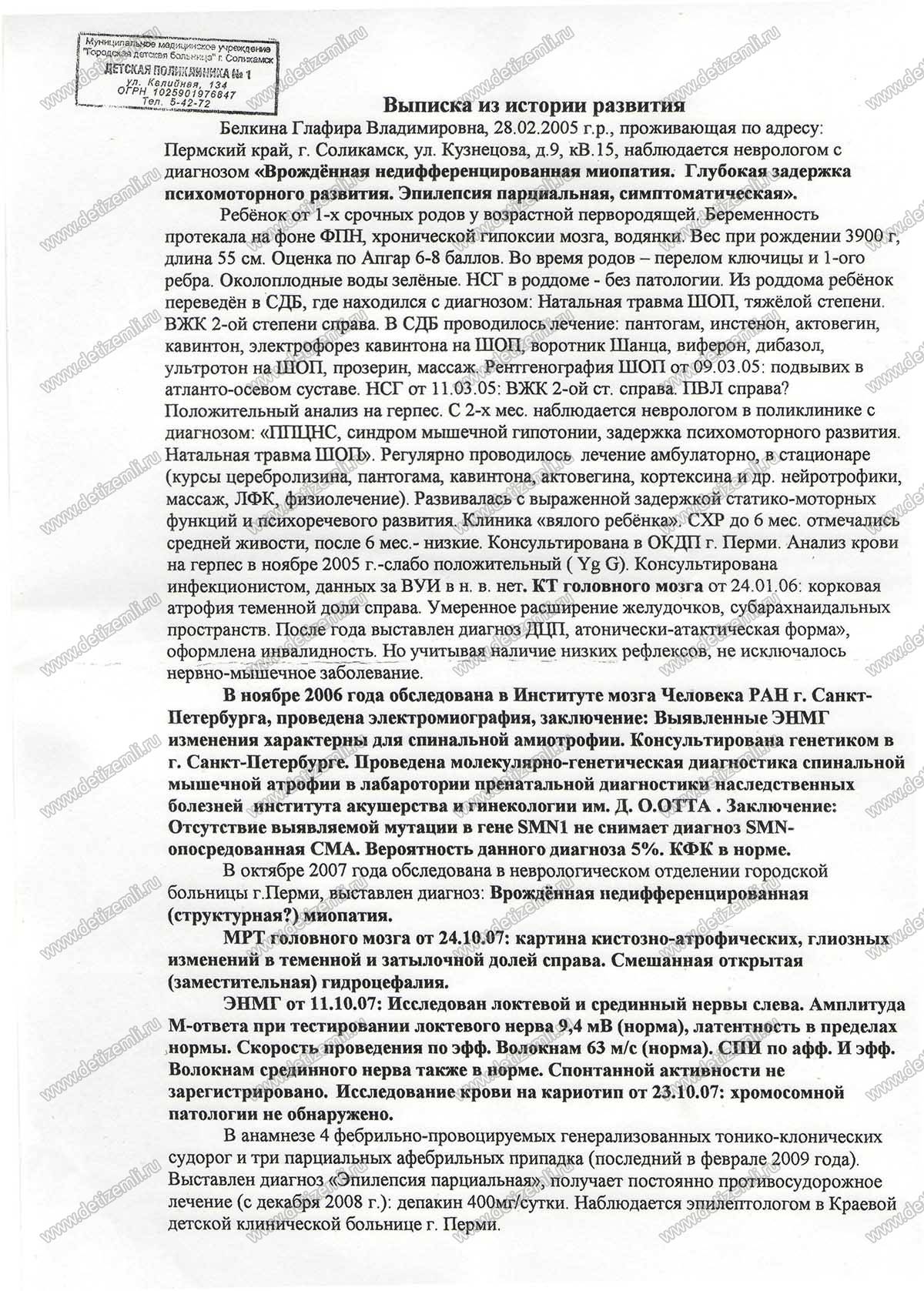 Мы применяли иппотерапию, лечение аппаратом ДЕНАС, принимали пищевые добавки, гомеопатические препараты, принимали скипидарные и травяные ванны. Ездили к различным народным целителям. Закаливались. Мы пробовали многое, что-то осталось с нами, а от чего-то отказались. За все время наших исканий врачи нам меняют уже третий диагноз. Сейчас он звучит так «врожденная структурная недифференцированная миопатия». Диагноз ДЦП сняли. Но от смены названия суть не меняется. Дочка на сегодняшний день пока не ползает, не ходит, не говорит. Может, можно было бы уже и смириться. Но дочка у меня такая замечательная, с такими ясными и умными глазами. Так хочется ей помочь. И пока у меня еще есть силы и желание, я буду искать еще какие-нибудь новые перспективные методы лечения. И, возможно, я их нашла. Узнала из общения с такими же мамами детей-инвалидов. Они уже попробовали и у детей были положительные результаты. Мне порекомендовали лечение по методу обкалывания проф. И. А. Скворцова. Лечение в этой клинике стоит 52.500 т. руб. соответственно. Дочку я воспитываю одна, пока нахожусь в отпуске без содержания, помогают родители-пенсионеры. Но сами понимаете, такими силами много средств не соберешь. А одного курса в этих клиниках будет маловато для хорошего эффекта. Поэтому приходиться обращаться за помощью к добрым людям, т. е. к Вам. «Просите и услышат, стучите и откроют». Я думаю мы постучались в правильную дверь и именно здесь нас услышат. Спасибо.