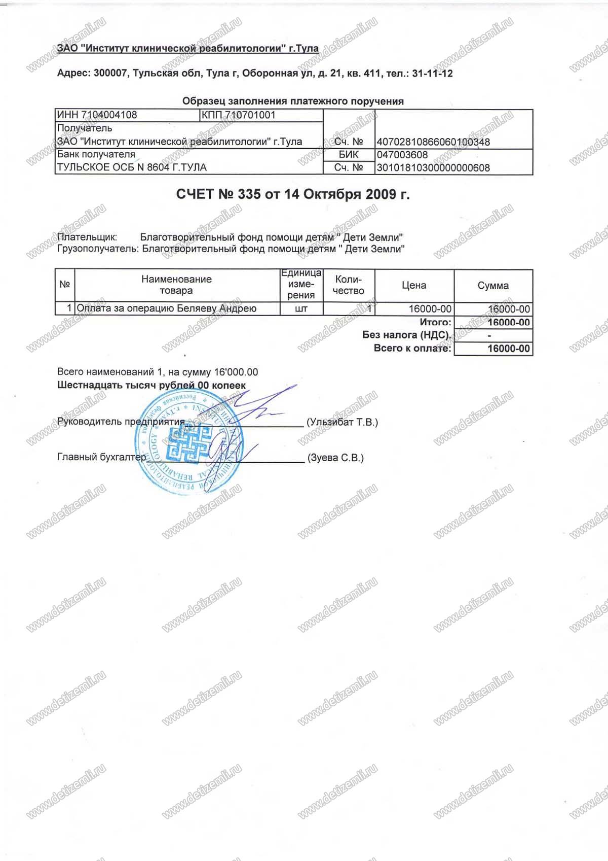 Оплачена операция Беляеву Андрею в г. Тула стоимостью 16 000 рублей.