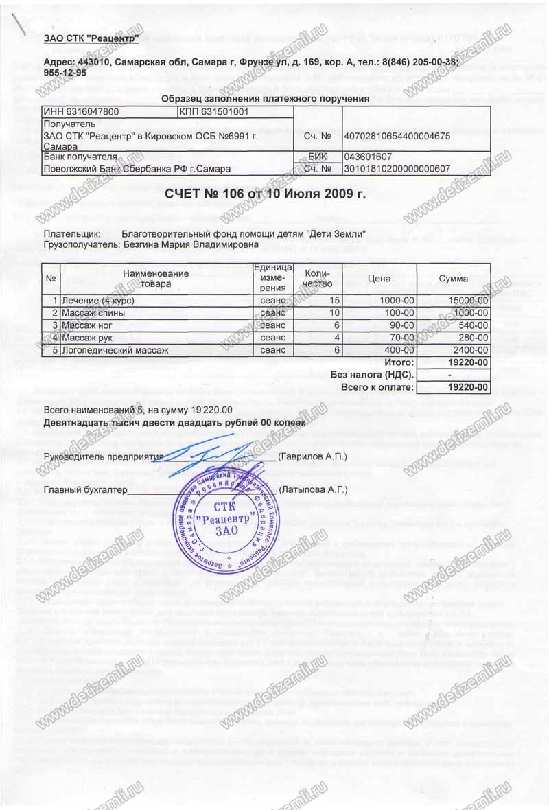 Оплачен четвертый курс лечения Безгиной Маши в СТК "Реацентр" г. Самара стоимостью 19 220 рублей.