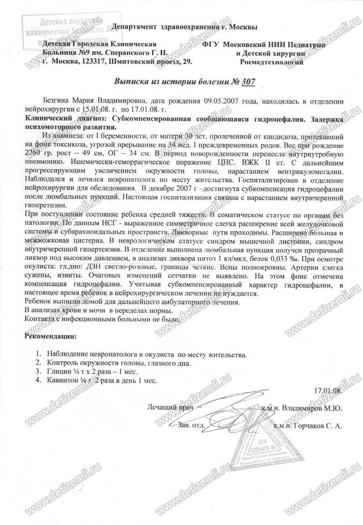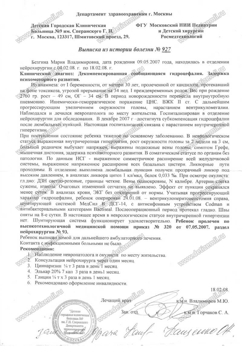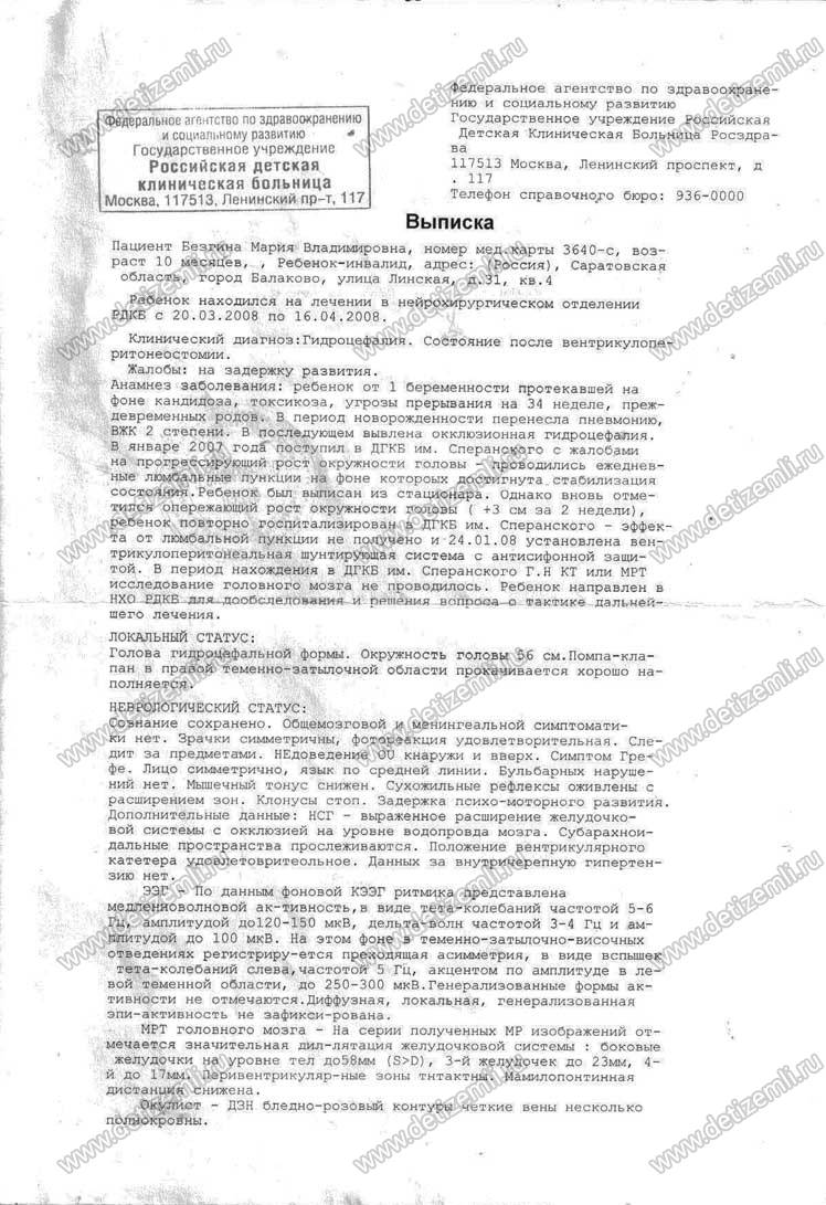 Прошу Вас оказать мне материальную помощь на лечение моей дочери-ребенка-инвалида Безгиной Марии Владимировны 09.05.2007 года рождения. В возрасти 5-ти месяцев у нее стал резко увеличиваться размер головы. Мы обратились за консультацией в ДГКБ №9 им. Сперанского (г. Москва). Диагноз был - гидроцефалия. Девочку поставили на учет, определили методы лечения. Но болезнь прогрессировала. В декабре 2007 - январе 2008 г. в той же клинике было проведено несколько люмбальных пункций, но это не дало положительного результата. В феврале 2008г. в ДГКБ им.Сперанского ребенку была сделана операция и установлена шунтирующая система для оттока ликворной жидкости из головного мозга. Результатом болезни явилось задержка психо-моторного развития. Кроме того выявилась плоско-вальгусная деформация стоп.