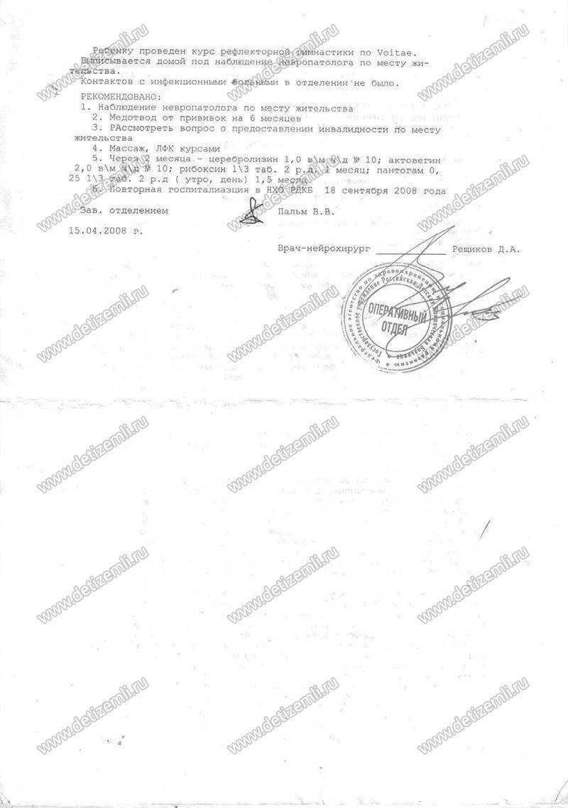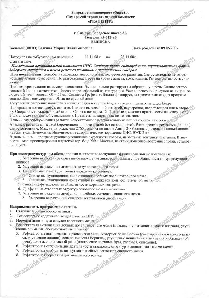 Ребенок прошел два курса лечения и реабилитации в РДКБ(г.Москва) в 2008г и январе 2009г.,а также 2 курса рефлексотерапии в "Реацентре" (г. Самара) в ноябре 2008г. и в марте 2009г. В июне намечен 3 курс рефлектотерапии в "Реацентре", а в сентябре госпитализация в отделение восстановительных методов лечения в РДКБ.
