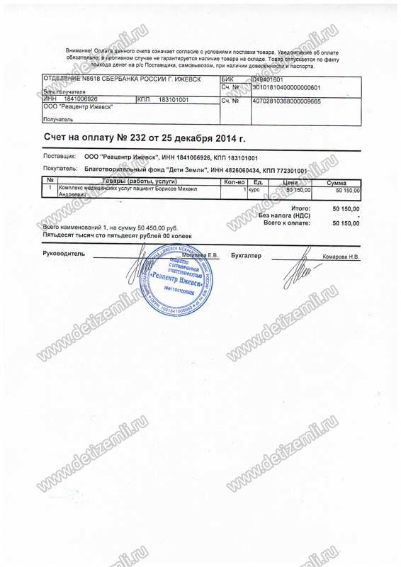Оплачено лечение Миши стоимостью 50150 рублей.