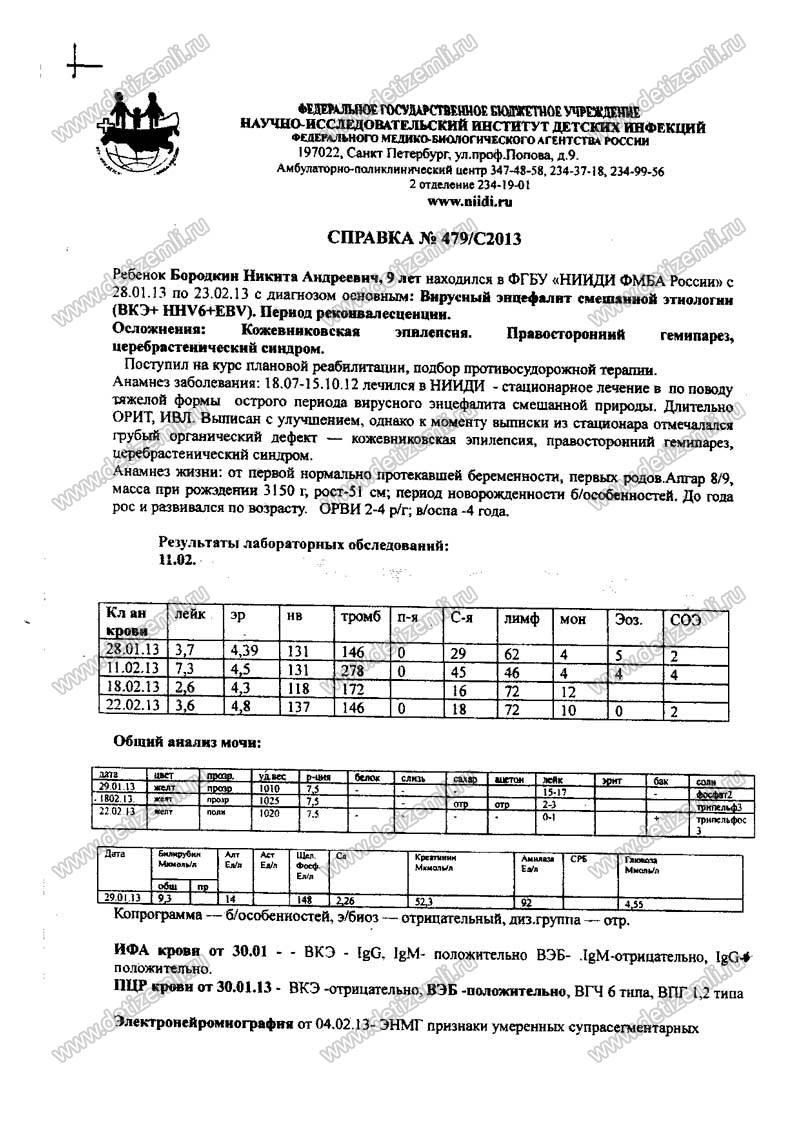 Московский благотворительный фонд помощи детям «Дети Земли» открывает сбор благотворительных пожертвований на лечение Бородкина Никиты. Ребенка в 2012 году укусил энцефалитный клещ, мальчик был на грани жизни и смерти. Более трех месяцев пришлось лечиться в больнице. Сейчас Никите необходимо пройти курс лечения стоимостью 140000 рублей. Мальчику очень нужна Ваша помощь!