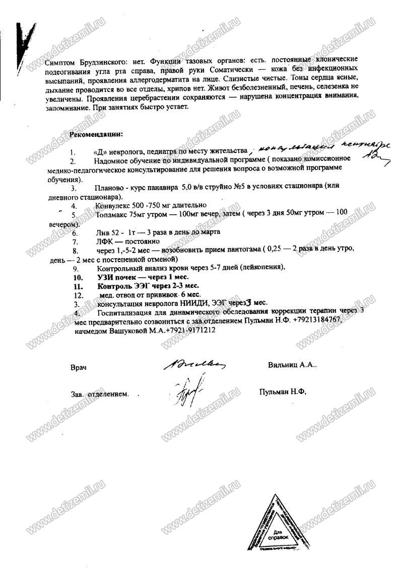 Я, Смирнова Наталья Викторовна, мама Никиты 2003 г.р., обращаюсь к Вам за помощью. В июле 2012 г. моего сына укусил энцефалитный клещ. Мы обратились в больницу города Пестово по месту жительства. У ребенка была температура 39С, речь не разборчивая и перестали работать правая ручка и ножка. Сына положили в реанимацию. Он пролежал сутки. Диагноз не смогли установить, так как клеща на ребенке я не обнаруживала. Решили переправить нас в детскую больницу Великого Новгорода. Там мы пробыли трое суток. Диагноз тоже никакой не поставили, который имел бы отношение к клещу. Сделали МРТ головы и сказали, что надо договориться с