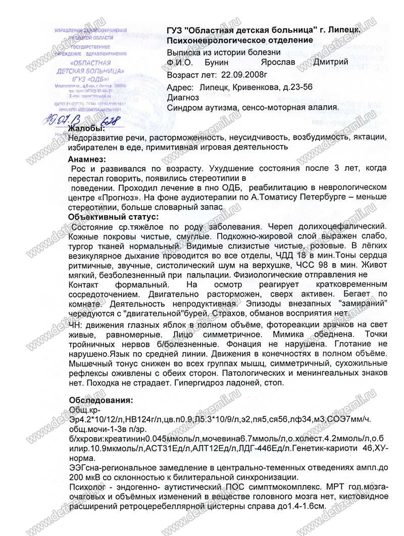 С четырёх лет Ярослав начал замыкаться в себе, потерял интерес к запоминанию, начал меньше разговаривать. В поведении появилось много однообразных движений, появился страх перед незнакомыми людьми. После исследований и амбулаторного лечения был поставлен диагноз «аутизм». Причина заболевания не установлена. Врачи считают, что своевременное лечение приведет к хорошим результатам. Нам удалось пройти два курса лечение в
