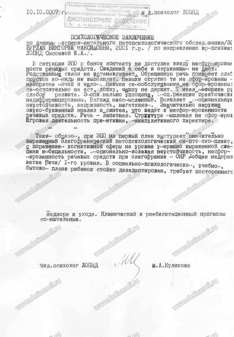 Диагноз: органическое поражение центральной нервной системы, задержка психоречевого развития, олигафрения первого уровня