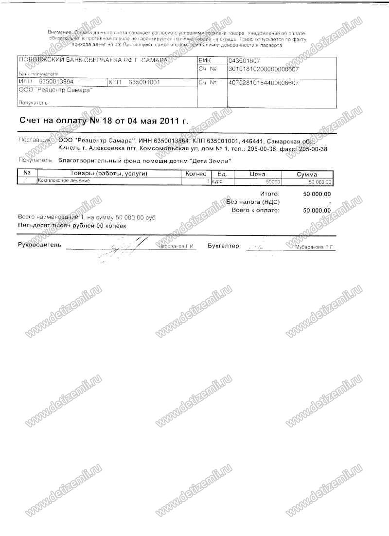 Полностью оплачено лечение Вероники в ООО «Реацентр» стоимостью 50 000 рублей.