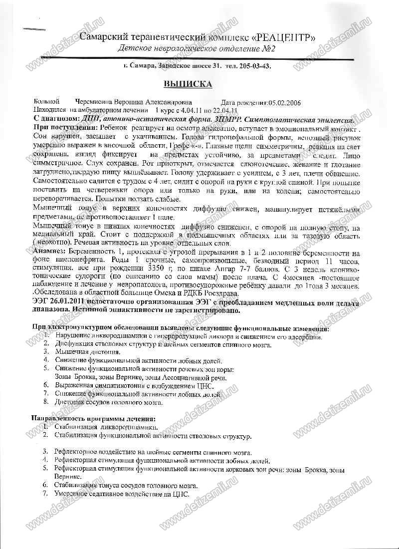 Здравствуйте. Обращается к вам за помощью Черемисина Ольга Борисовна из города Омска. Так произошло, что в нашей семье случилась беда. В 2006 году в результате тяжёлых родов с последующими осложнениями родилась моя дочь Вероника. Практически с первых дней жизни девочка заболела желтухой, постоянно плакала, кричала, были вздрагивания при засыпании, не было попыток удерживать голову. С трёх месяцев начались бесконечные походы по больницам, обследования, медикаментозная и физическая реабилитация. Однако дочка вовремя не села, не начала ползать, не пошла, не заговорила.