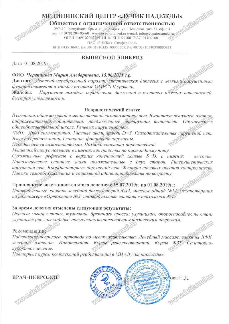 Из письма мамы. Маша родилась недоношенной. Росла и развивалась с задержкой, сидеть стала в 10 месяцев, ползать в 1 год 4 мес. Сейчас ей 8 лет, она ходит в обычную общеобразовательную школу. Она плохо стоит и часто падает, не может спускаться и подниматься по лестнице самостоятельно, по улице ходит с поддержкой за одну руку. Она очень общительная, у нее много друзей. Нам очень нужно пройти курс лечения стоимостью 83750 рублей. Помогите нам!