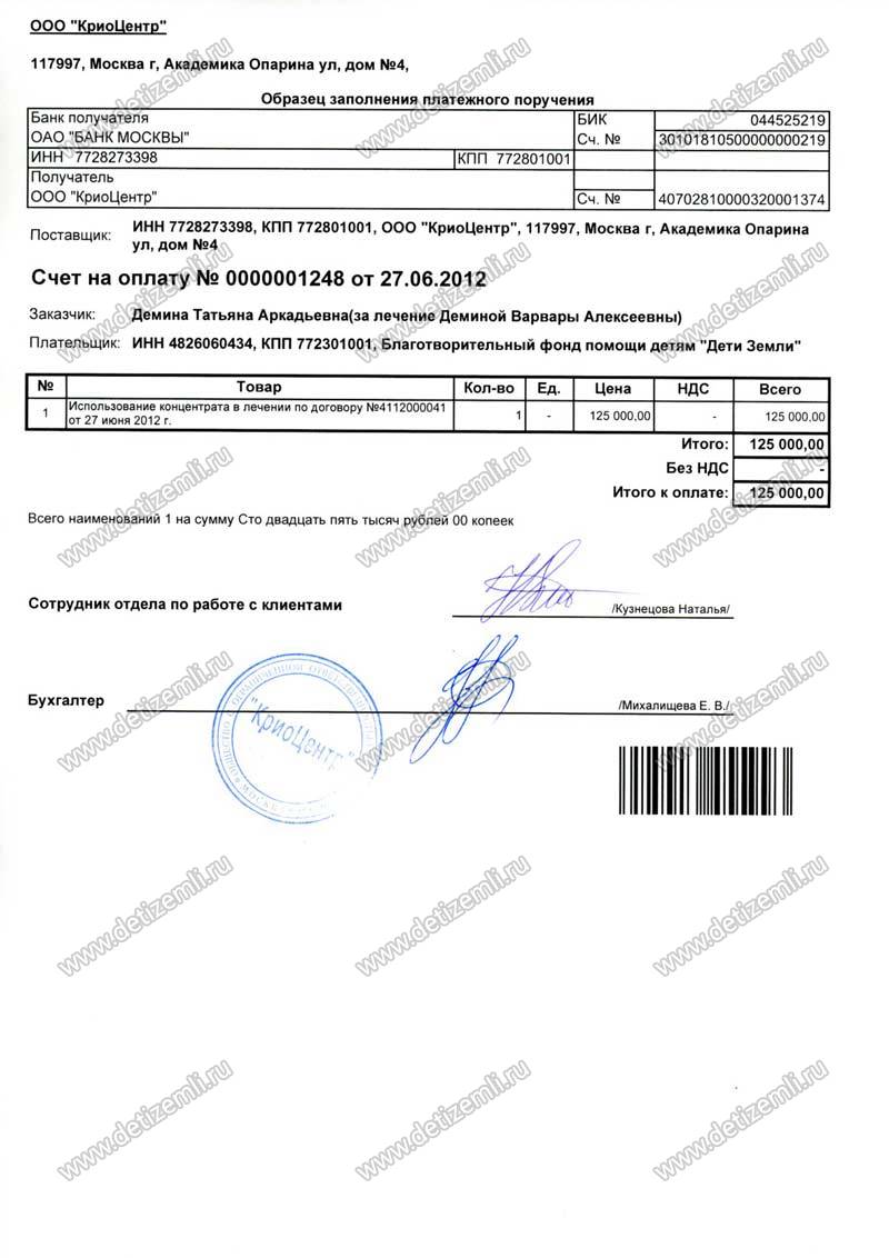 Оплачено лечение стволовыми клетками стоимостью 125000 рублей.