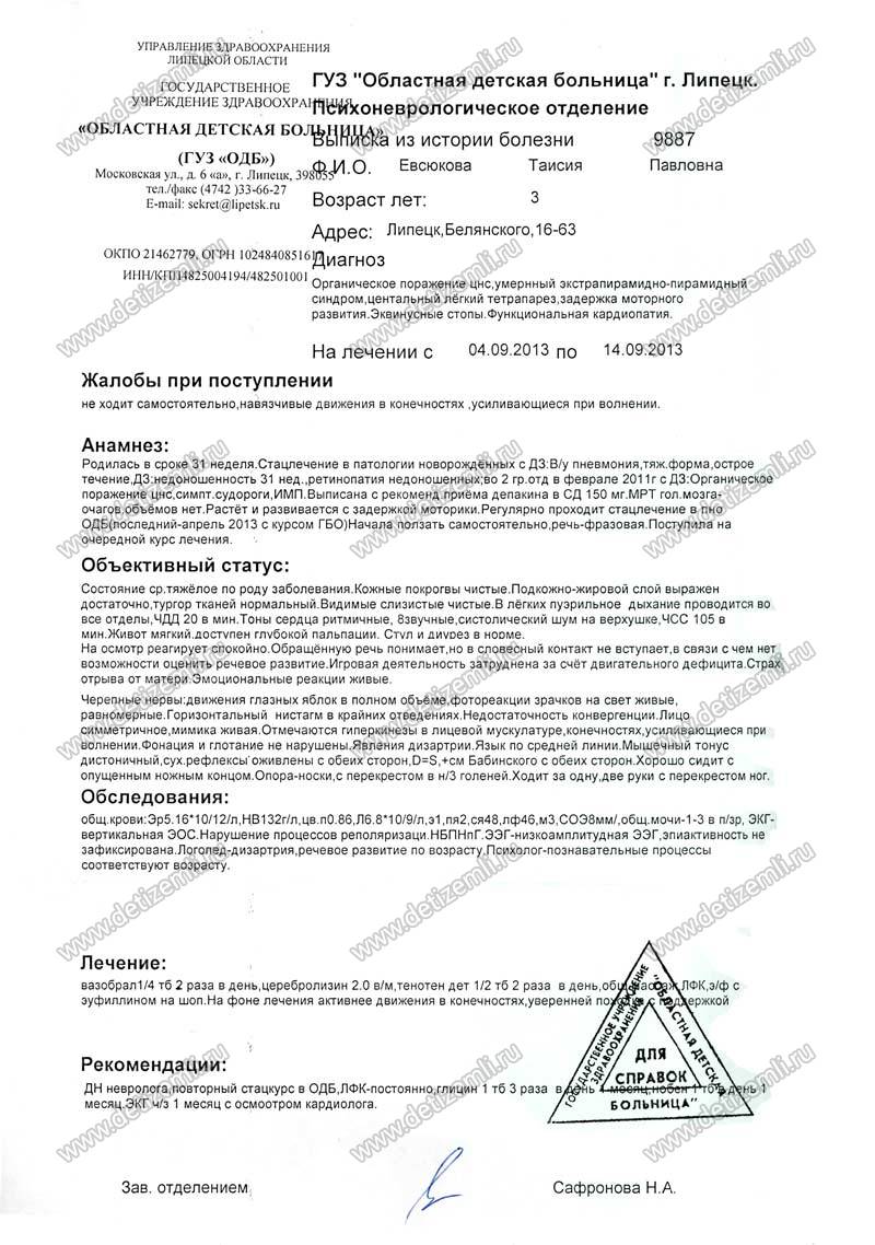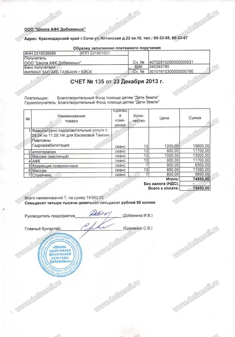 Я Евсюкова Диана Александровна, мать Евсюковой Таисии, обращаюсь в фонд «Дети Земли» с просьбой в оказании помощи сбора финансовых средств на оплату счета в ООО"Школа АФК Добежиных». Счет в размере 74 950 включает в себя большой спектр реабилитационных мероприятий. Мы возлагаем большие надежды на эту реабилитацию.