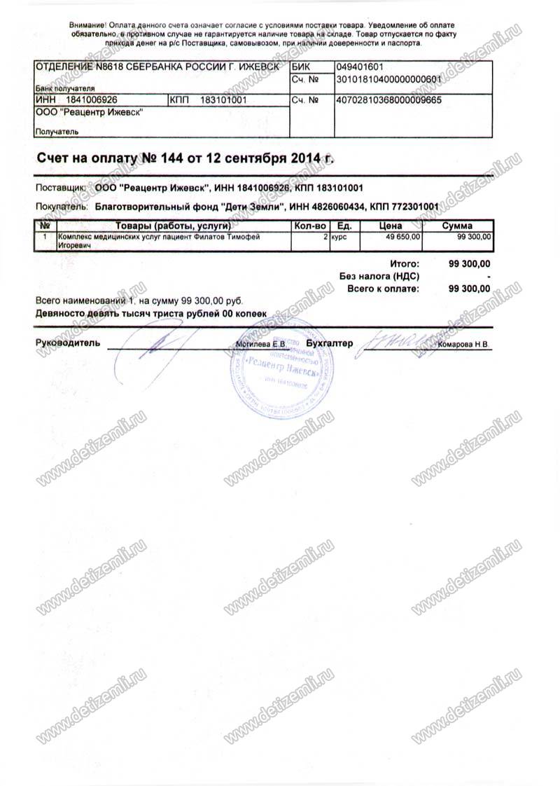 Оплачено лечение Тимофея стоимостью 99300 рублей.