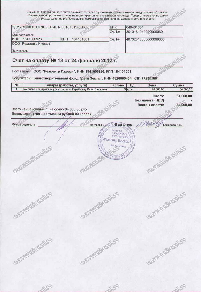 Оплачено лечение Вани стоимостью 84000 рублей