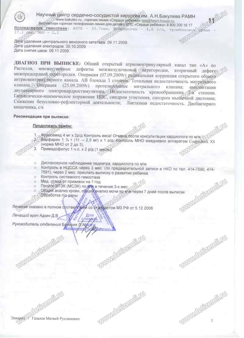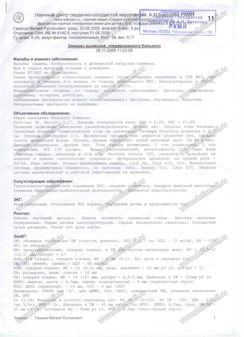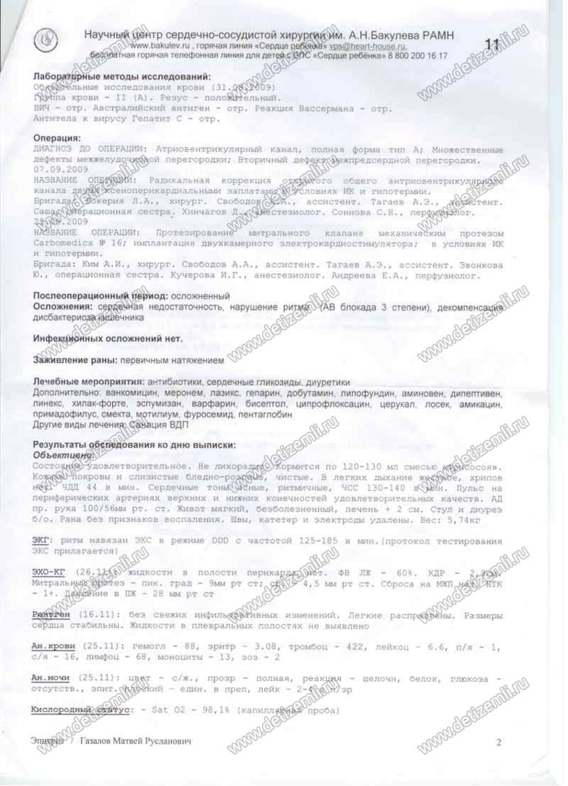 Здравствуйте, меня зовут Газалова Залина. 20.05.2009 года у меня родился сын Газалов Матвей. Во время беременности на УЗИ поставили врожденный порок сердца. В 3,5 месяца его жизни, в сентябре 2009 года он перенес две сложные операции на сердце, где был имплантирован электрокардиостимулятор и сделано протезирование митрального клапана. В реанимации он провел 2 месяца, чудом остался жив, надежды даже врачи никакой не давали. 26 ноября его выписали из Бакулевского центра. И мы поехали домой. Было назначено лекарство для разжижении крови и для этого чтобы принимать эти таблетки, необходимо вести контроль свертываемости крови 1раз в три дня, смотря по показателям крови. Был приобретен коагучек, но полоски для него очень дорогие. Я мама одиночка и не работаю,