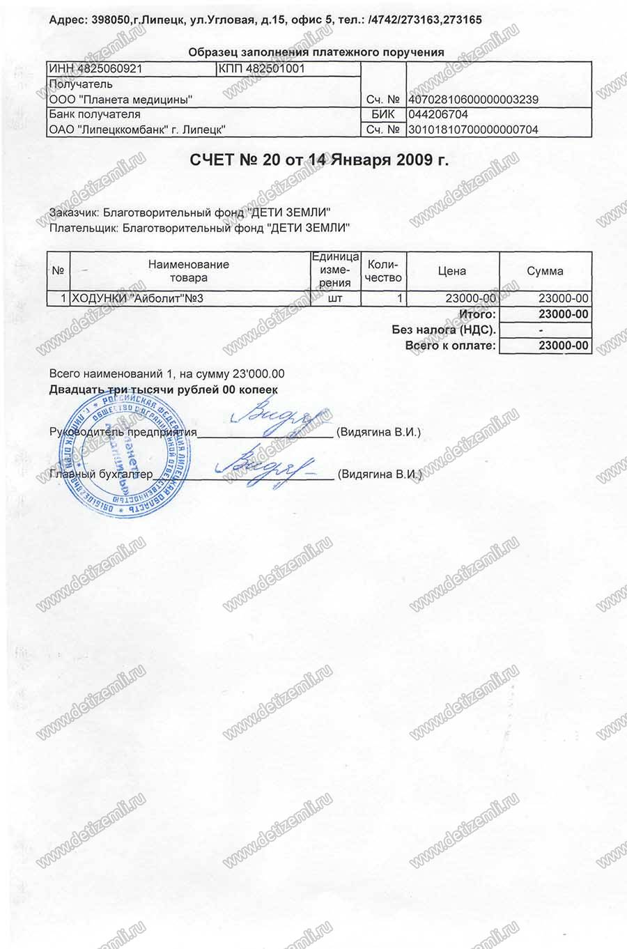 Произведена оплата за ходунки "Айболит" в сумме 23 000 рублей.