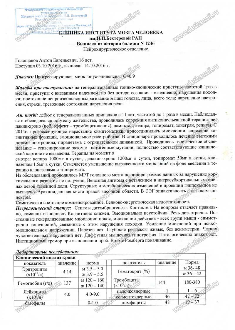 Здравствуйте, я мама Голощапова Антона. Мой сын до 11 лет рос и развивался, был активным, любознательным. Антон занимался с 6 лет бальными танцами, учился на 4и 5. Занимал первые места в школьных олимпиадах. В 11 лет на фоне полного благополучия случился первый приступ эпилепсии. Жизнь разделилась, в той жизни остались радость, гордость, надежда. Сейчас боль, волнение, слезы, страх за него, большое желание помочь своему ребенку.