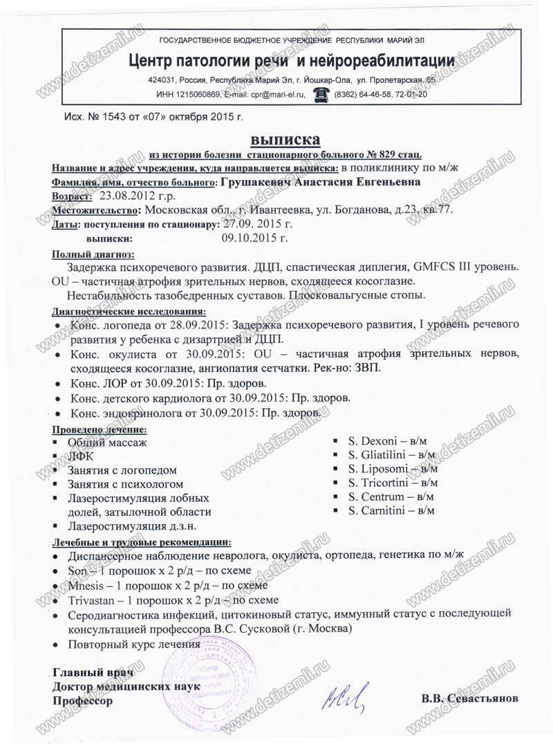 Я мама Грушакевич Насти, 2012 г.р. выражаю Вам благодарность за оказанную помощь в оплате курса лечения в санатории «Приморье» (г. Евпатория).