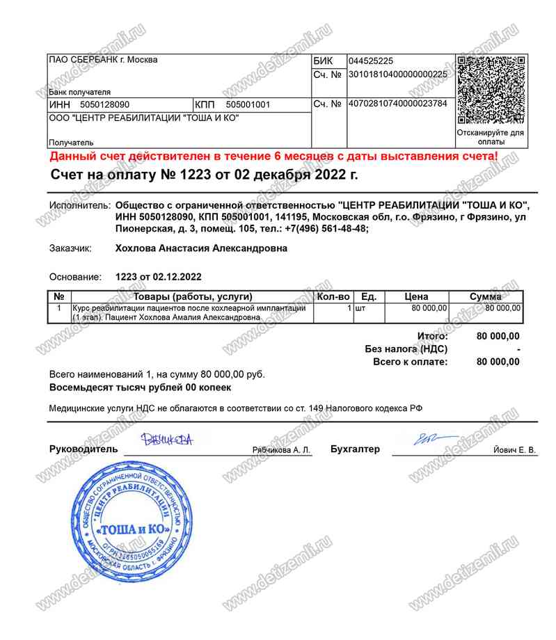 Оплачено лечение Амалии стоимостью 80 000 рублей.