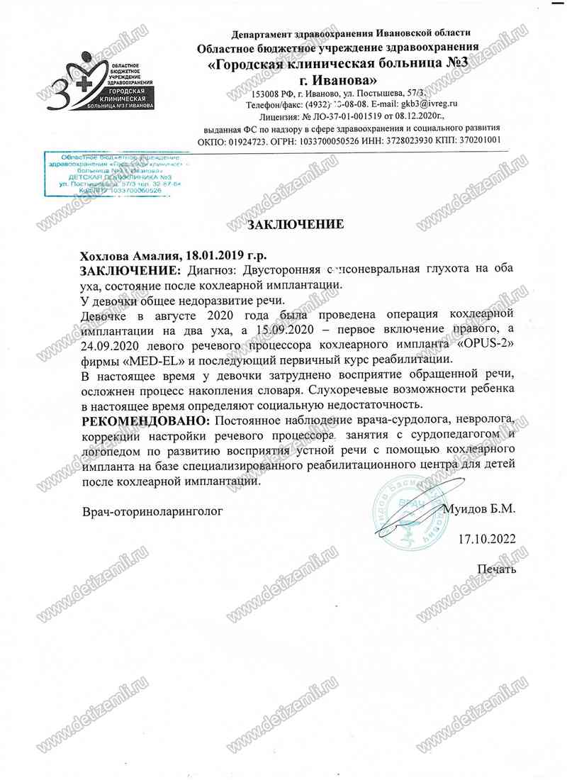 Благотворительный фонд помощи детям «Дети Земли» открывает сбор пожертвований на лечение Хохловой Амалии из Иваново. У девочки двухсторонняя глухота и на прохождение реабилитации срочно требуется 80000 рублей. Помогите больному ребенку!