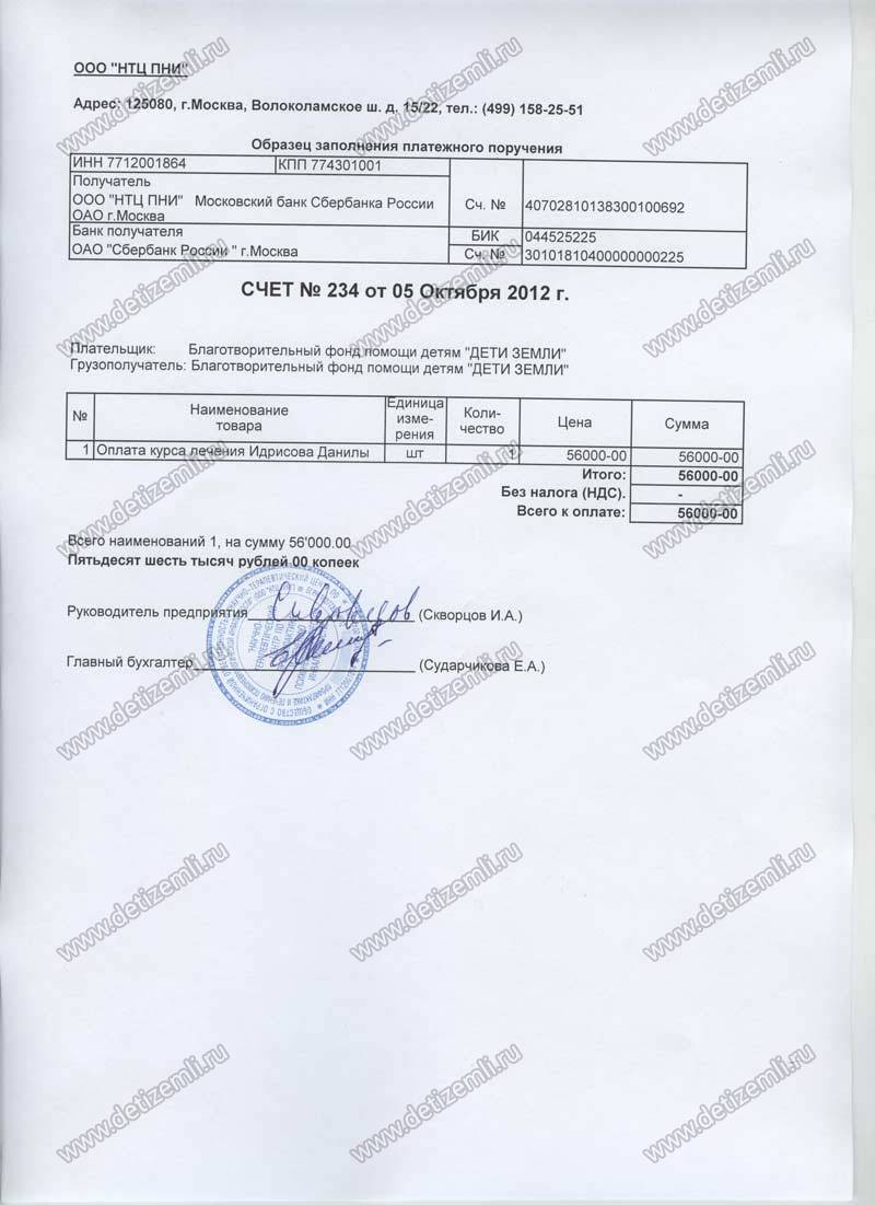 Оплачено лечение Данилы в клинике Скворцова стоимостью 56 000 рублей.