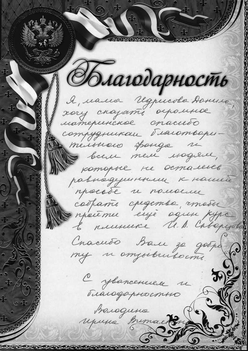 Благотворительный фонд помощи детям «Дети Земли» благодарит всех наших жертвователей, которые откликнулись и помогли в сборе средств на лечение Данилы. В самое ближайшее время курс лечения будет оплачен и ребенок будет направлен в клинику. Спасибо огромное!