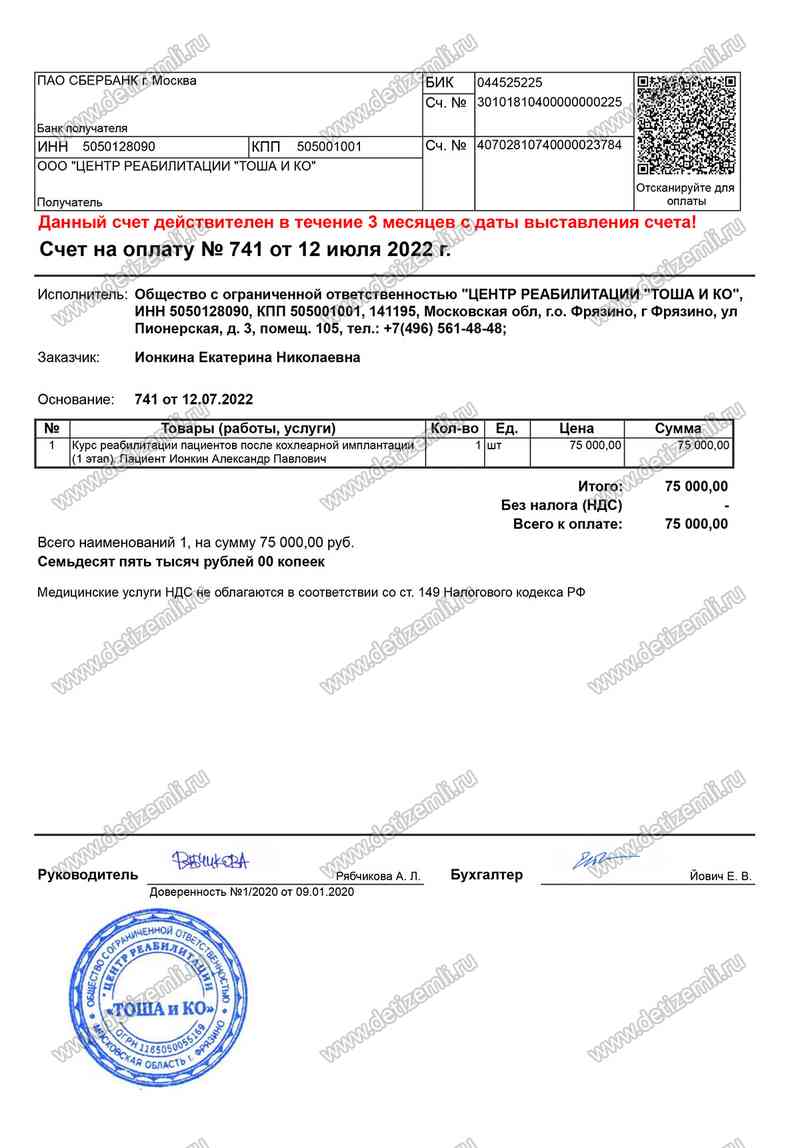Оплачено лечение стоимостью 75000 рублей.