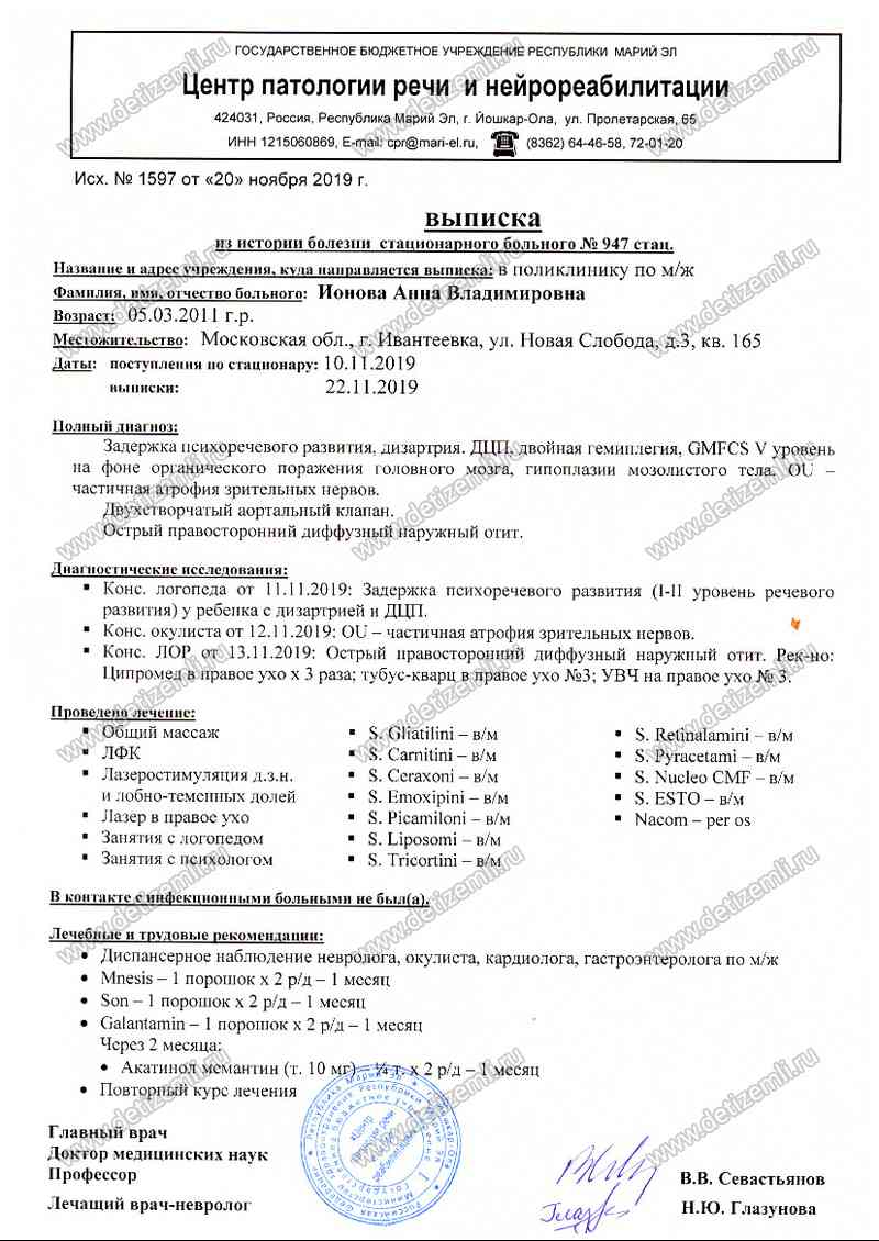 Анюта родилась раньше срока в 7месяцев. Во время родов произошло сильное кровоизлияние в мозг, Аня пролежала в реанимации 1,5месяца. Когда угроза жизни миновала, нам сказали, что дочка не совсем здорова. В это мы не могли поверить. Много раз слышала от докторов: Надежды нет, может быть ребенок чему-нибудь научится, но в вашем случае ждать нечего. Во время госпитализации в Центре патологии речи и нейрореабилитации. назначили лекарственную терапию и в ходе проводимой реабилитации, пошла положительная динамика.