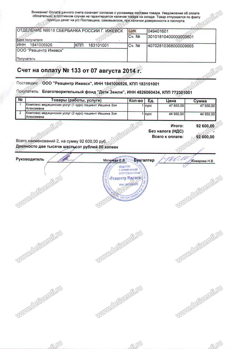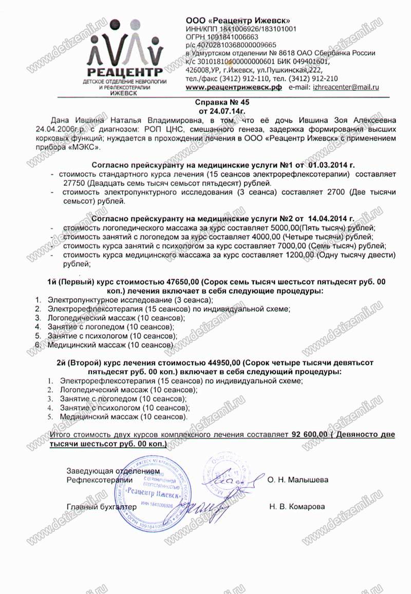 Оплачено лечение Зои стоимостью 92600 рублей.