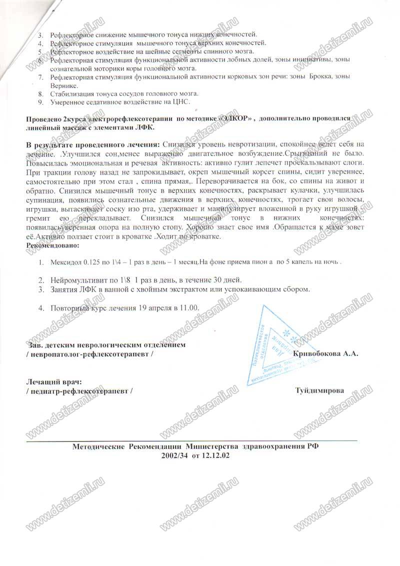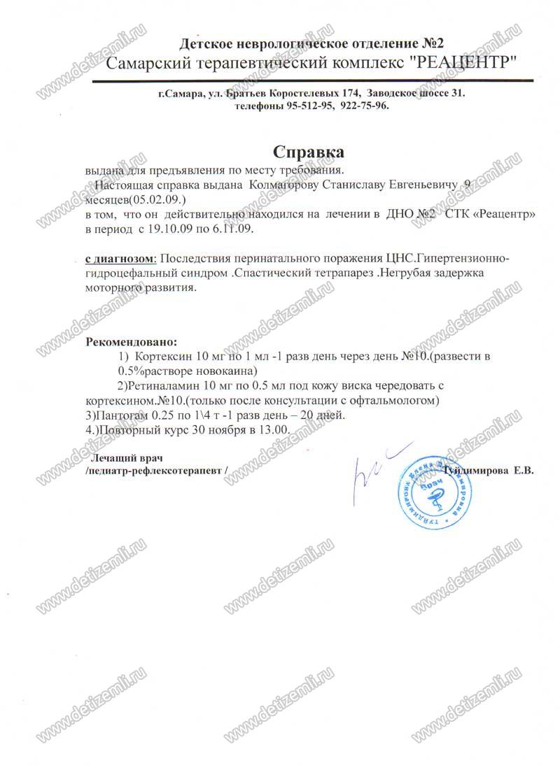 В интернете на форумах, через знакомых узнала о ЗАО СТК «Реацентр» г. Самары и, созвонившись с ними, решила, что полетим туда. Очень далеко от дома, долгий перелет с пересадкой и ожиданием, незнакомый город, маленький ребенок на руках! Было очень много страхов, но все было ничтожно по сравнению с целью мне надо вылечить сыночка. Прилетели в первый раз в Самару, когда Стасу было восемь месяцев. Ходили на лечение, делали массаж. Курс длится 3 недели, затем 3 недели перерыв и еще 3 недели лечения. Т.к. лететь домой долго и очень затратно, в перерыве оставались там же. И вот первые успехи после первого курса лечения Стас начал переворачиваться, постепенно сидеть и не заваливаться. По приезду домой, после двух курсов лечения, Стасик научился ползать, к году стоял у опоры. Мы так же продолжали заниматься ЛФК, гимнастикой, плаванием и лекарственной терапией.