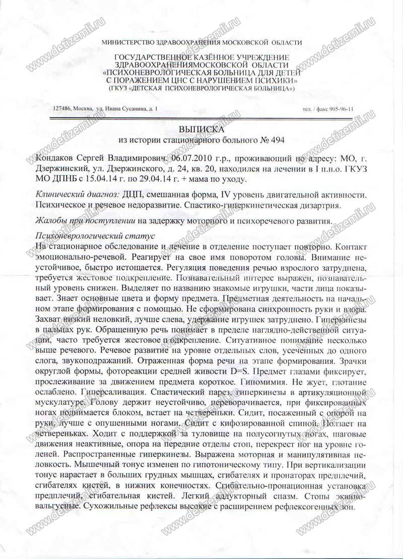Добрый день, уважаемый фонд. С большой надеждой пишет вам мама Кондакова Сергея. Родился наш сын 6 июля 2010 года. Наш диагноз: спастическая диплегия с мозжечковым и гиперкинетическим синдромом. Смешанная дизартрия. Сын умеет ползать на четвереньках, может сидеть без опоры на диване, может сам стоять около 1 минуты. Интеллект у Сережки сохранен. Он различает цвета, формы, знает некоторые цифры и буквы. По характеру он очень добрый и любознательный мальчик. Его силе воле и упорству можно позавидовать.