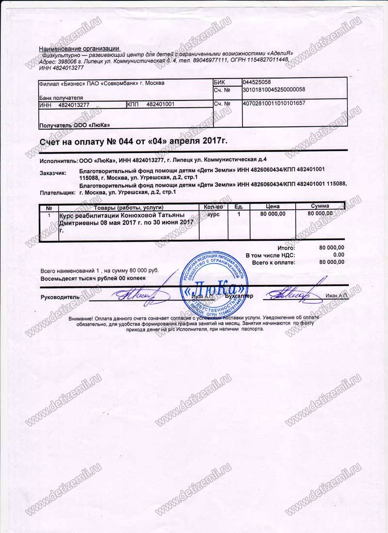 Оплачено лечение Тани стоимостью 80000 рублей.