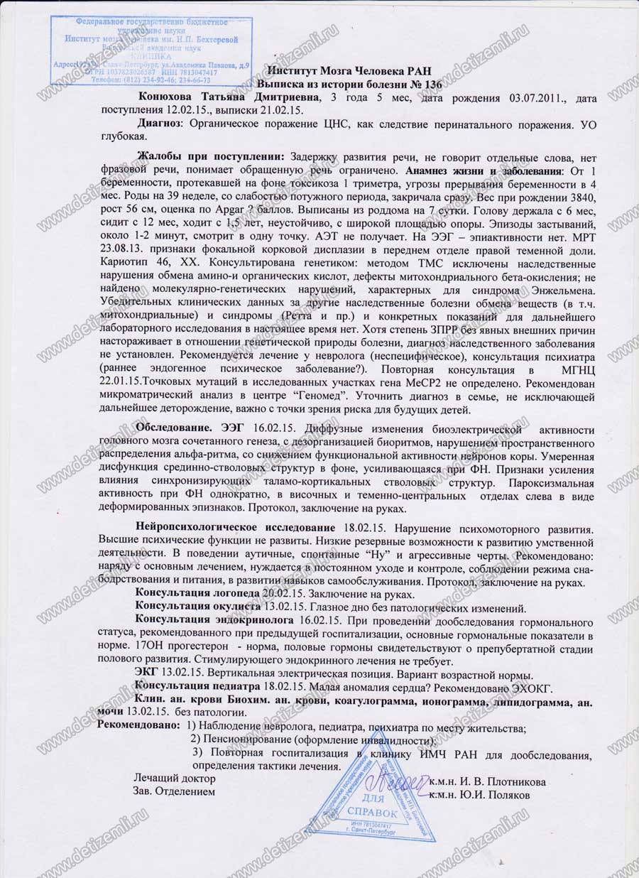 Здравствуйте, уважаемый Благотворительный фонд «Дети земли»! Обращается к Вам Конюхова Наталия Ивановна — мама ребенка инвалида Конюховой Татьяны 3 июля 2011 года рождения. У Тани органическое поражение ЦНС, глубокая умственная отсталость. Сейчас Танюше 5 лет 9 месяцев. Сама не ест. Самое важное для меня — услышать «МАМА»… Но речи нет. На свое имя не оборачивается. Обращенную речь не понимает.