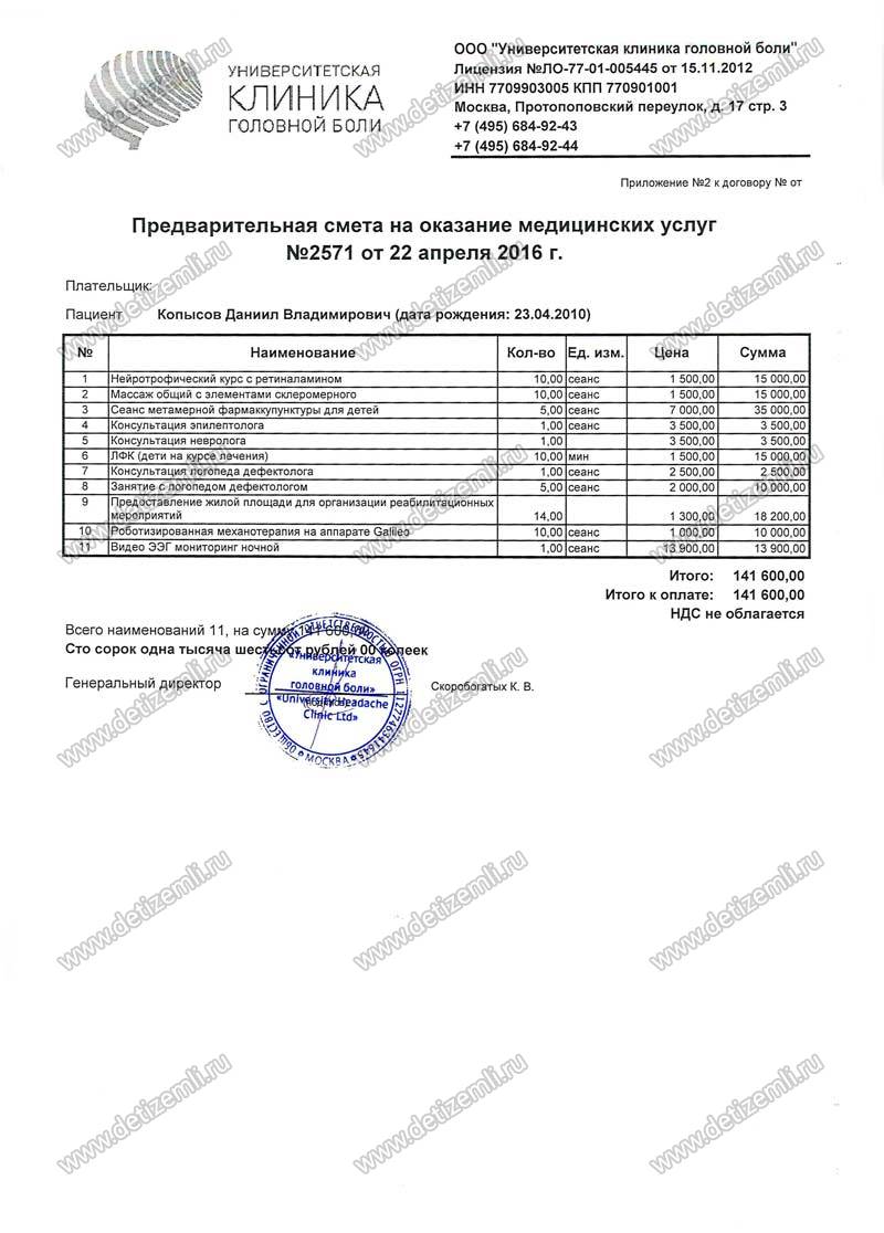 Оплачено лечение Копысова Даниила стоимостью 141600 руб.