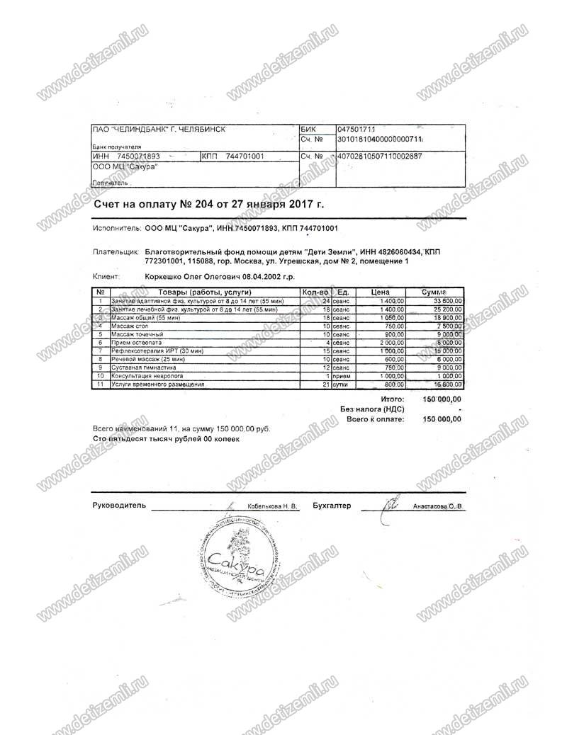 Оплатили лечение Олега стоимостью 150 000 рублей.
