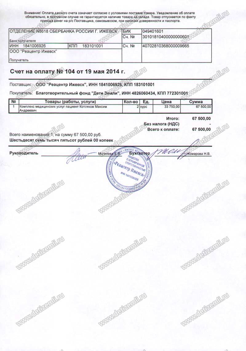 Оплачено лечение Максима стоимостью 67 500 рублей.