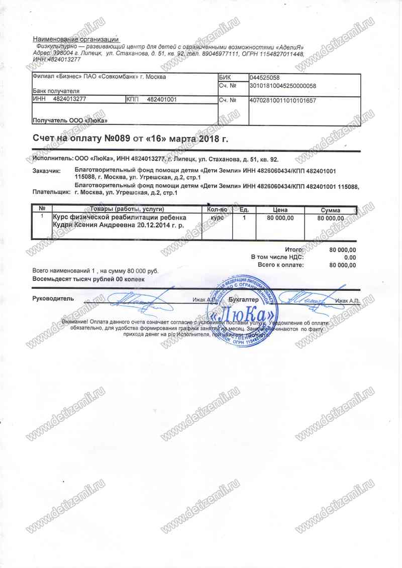 Оплачено лечение Ксении стоимостью 80000 рублей.